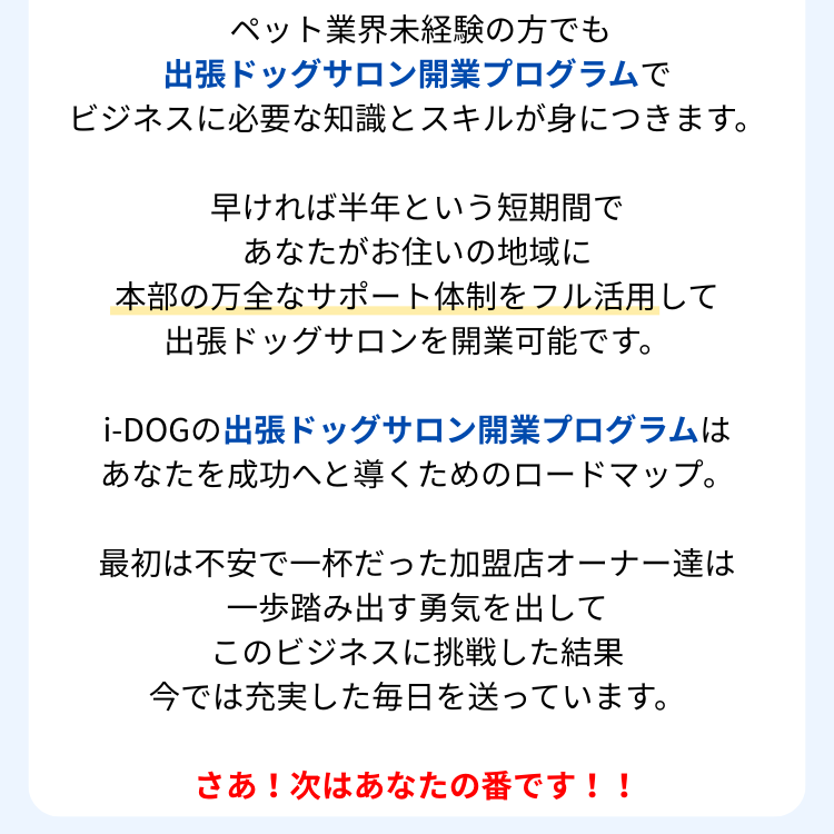 「出張ドッグサロン開業プログラム」は、ペット業界の経験がない方でも安心して開業できるよう、体系的にサポートいたします。シャンプーの技術はもちろん、集客方法や経営ノウハウまで、一から丁寧に指導いたします。